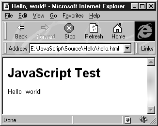 Рис. 1.1. Внешний вид документа HTML с первой программой на JavaScript Как мы уже говорили, программы или сценарии JavaScript встраиваются в документ HTML. Взгляните на листинг 1.1, в котором мы привели исходный текст документа с нашей первой программой, составленной на JavaScript. Листинг 1.1. Файл chapter1/hello/hello.html
