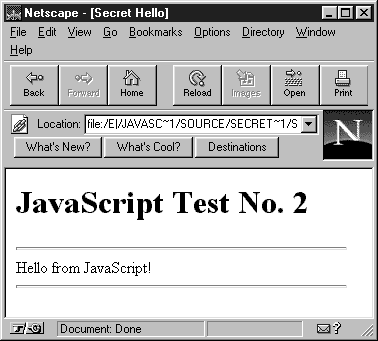 Ссылка оформлена с применением операторов <SCRIPT> и </SCRIPT>, однако между этими операторами нет ни одной строчки исходного текста. Мы перенесли этот текст в файл hello.js (листинг 1.3). Листинг 1.3. Файл chapter1/SecretHello/hello.js