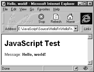 Рис. 1.3. Сообщение выделено жирным шрифтом Рассмотрим исходный текст нашего документа HTML и встроенного в него сценария JavaScript. Прежде всего, обратите внимание на область заголовка документа, выделенную операторами <HEAD> и </HEAD>. В этой области расположено определение одной переменной и двух функций, оформленное с применением операторов <SCRIPT> и </SCRIPT>: