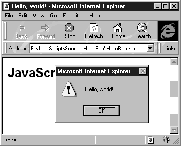 Рис. 1.4. Диалоговая панель, которая появляется при загрузке страницы в браузер В листинге 1.6 мы привели исходный текст сценария JavaScript, в котором вызывается функция alert, предназначенная для отображения диалоговых панелей с сообщениями. Листинг 1.6. Файл chapter1/HelloBox/HelloBox.html