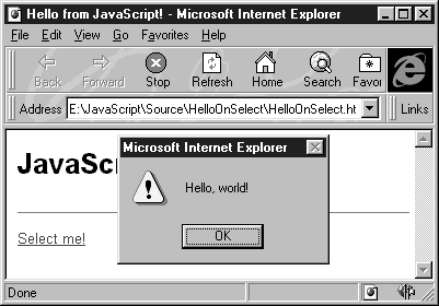 Для продолжения загрузки страницы необходимо нажать кнопку OK. Только после этого содержимое страницы (состоящее в данном случае из одной строки заголовка) появится на экране. Помимо представленной в этом примере диалоговой панели сценарии JavaScript могут выводить на экран и более сложные. В них пользователь может делать, например, выбор из двух альтернатив или даже вводить какую-либо информацию. Подробнее об этом мы расскажем позже. Вариация шестая: обработка событияВ языке JavaScript есть удобные средства обработки событий. В нашем следующем примере когда пользователь пытается выбрать ссылку “Select me!” (рис. 1.5), разместив над ней курсор мыши, на экране появляется диалоговая панель Microsoft Internet Explorer с сообщением “Hello, world!”.