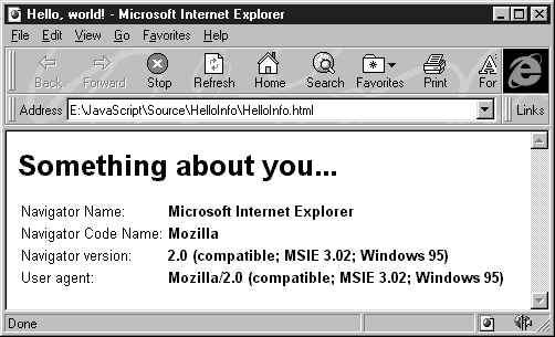 Обратите внимание, что строка задана не в двойных кавычках, а в одинарных. В сценариях JavaScript допустимо использовать и те, и другие кавычки, однако закрывающая кавычка должна быть такой же, что и открывающая. Внутренняя пара кавычек должна отличаться от внешней. Вы можете установить обработчики таких событий, как загрузка страницы, щелчок по ссылке или кнопке формы, выбор ссылки или поля формы и других событий. Более подробно обработка событий будет рассмотрена позже. Вариация седьмая: с определением типа браузераПоследний пример сценария, который мы рассмотрим в этом разделе, показывает, как программа JavaScript может легко определить тип и версию браузера. На рис. 1.6 показан результат просмотра документа HTML с этим сценарием при помощи браузера Microsoft Internet Explorer.