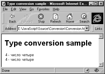 Здесь мы объявили переменную szTextBuf и проинициализировали ее пустой строкой. Далее мы присвоили этой строке сумму числа 4 и двух текстовых строк: szTextBuf = 4 + " - число четыре" + "<BR>"; При вычислении этого выражения значение 4 было автоматически преобразовано в текстовую строку. Дальнейшее суммирование выполнялось как слияние (конкатенация) трех текстовых строк. Обратите внимание на символ неразделяющего пробела , который используется в документах HTML. Если заменить его на обычный пробел, то после конкатенации строк этот пробел исчезнет. В следующей строке мы преобразовываем текстовую строку “2” в численное значение с помощью функции parseInt, прибавляем к результату преобразования число 2, а затем выполняем конкатенацию с двумя текстовыми строками: