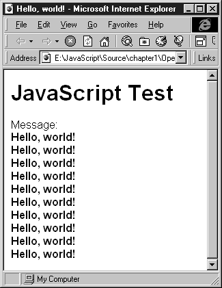 Рис. 1.9. Сценарий отображает в документе HTML десять одинаковых строк Исходный текст первого сценария представлен в листинге 1.10. Листинг 1.10. Файл chapter1/Operators/for.html