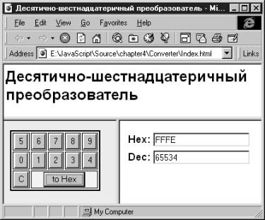 Исходный текст документа, содержащего форму с полями Dec и Hex, представлен в листинге 4.3. Листинг 4.3. Файл chapter4/Converter/main.html