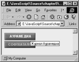 Параметры оператора <IMG> определяют адрес файла с изображением, выравнивание текста, расположенного возле изображения и так далее. С помощью параметров HEIGHT и WIDTH вы можете выполнять масштабирование графических изображений. Значение этих параметров можно указывать в процентах от ширины окна просмотра. Масштабирование позволяет подготовить графический файл относительно небольшого размера, который быстро передается через Internet, и занимает при этом значительную площадь в окне браузера. Вы, однако, не можете масштабировать сегментированные графические изображения и фоновые изображения. Применение сегментированной графики мы подробно рассмотрели в 29 томе “Библиотеки системного программиста. Если в документе HTML размещено несколько растровых изображений, то вы можете адресовать соответствующие объекты как элементы массива document.images. Например, первое изображение адресуется следующим образом: document.images[0]. Однако в некоторых случаях удобнее пользоваться именами изображений, определенными параметром NAME оператора <IMG>. Объект-изображение имеет свойство src, соответствующее параметру SRC оператора <IMG>. Адресуясь к этому свойству, вы можете не только определять текущий адрес URL изображения, но и задавать новый. Этим мы воспользуемся в следующем разделе нашей книги. Динамическая замена растровых изображенийОдна из наиболее интересных возможностей, доступных при использовании сценариев JavaScript, заключается в динамической замене графических изображений, указанных в параметре SRC оператора <IMG>. Например, в следующей строке сценария JavaScript мы указываем, что изображение с именем btn1 должно иметь адрес URL pic/aurap.gif: document.btn1.src="pic/aurap.gif" Здесь мы указали неполный адрес URL, однако можно указывать и полный адрес. Что произойдет при выполнении приведенной выше строки сценария? Область, выделенная в окне браузера для растрового изображения btn1 будет заполнена изображением pic/aurap.gif. Если до этого там было другое изображение, оно будет заменено на новое. Как можно воспользоваться динамической заменой растровых изображений? Во-первых, вы можете создавать графические ссылки, которые изменяют свой вид, когда над ними находится курсор мыши. Во-вторых, с помощью замены растровых изображений в сценарии JavaScript можно создавать анимационные изображения. Рассмотрим примеры сценариев, решающих указанные задачи. Изменение внешнего вида графических ссылокВ документе HTML, внешний вид которого показан на рис. 5.1, находятся две кнопки, созданные как растровые графические изображения. Они используются для активизации ссылок, соответствующих двум другим документам HTML.