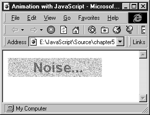 Рис. 5.2. Анимация с помощью сценария JavaScript В окне браузера последовательно отображаются кадры анимационного изображения (рис. 5.3), причем сначала в прямой, а затем - в обратной последовательности. Это выглядит так, как будто слово Noise периодически тонет в цветном шуме и затем проявляется вновь. Заметим, что похожий эффект мы уже получали совершенно другими средствами в аплете Java, исходный текст которого был опубликован в журнале “Мир ПК” №1 за 1998 год.
