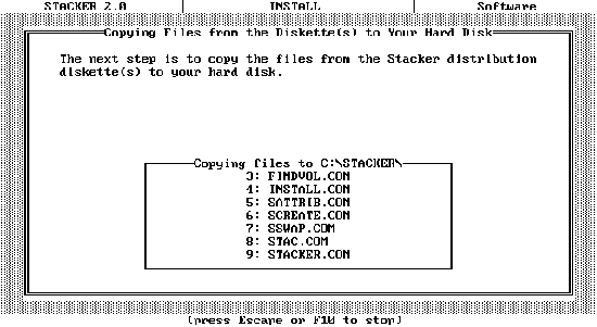 Вы можете согласиться с предложенным каталогом C:\STACKER или выбрать любой другой. После определения каталога нажмите клавишу <Enter>. Начнётся процесс копирования всех файлов с дистрибутивной дискеты в указанный вами на предыдущем этапе каталог. При копировании на экране будут отображаться имена переносимых на диск файлов: