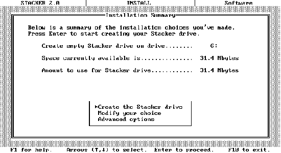 Вы можете согласиться с предложенным размером диска и нажать <Enter>. В этом случае всё свободное пространство на выбранном вами диске будет распределено файлу Stacker-диска. Вы можете также уменьшить предложенную величину. После определения размера диска вам будет предложено три возможности: