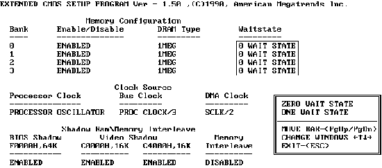Здесь можно задать конфигурацию памяти (Memory Configuration), параметры тактового генератора (Clock Source), режим теневой памяти и использование чередования при работе с памятью (Shadow RAM/Memory Interleave). С помощью клавиш перемещения курсора вы можете переключаться с одной области параметров на другую. Изменение значения параметров выполняется клавишами PgUp и PgDn. Когда вы будете нажимать на эти клавиши, в выбранной области будет происходить циклическое изменение значений параметров. Выберите область Waitstate. В этой области задаётся количество тактов ожидания при работе с оперативной памятью. Для увеличения скорости работы установите режим "0 WAIT STATE", при котором такты ожидания не используются. Затем с помощью клавиш перемещения курсора перейдите в область Shadow RAM/Memory Interleave. Установите режим использования теневой памяти ENABLED, как это показано на предыдущем рисунке. После изменения конфигурации нажмите клавишу ESC и выберите в появившемся меню строку "WRITE CMOS REGISTERS AND EXIT". Произойдёт перезгрузка компьютера. Обратите внимание на скорость тестирования оперативной памяти - после изменения её режима работы она может заметно возрасти. Описанная только что SETUP-программа - не