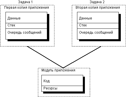 Рис. 3.3. Вызов функций из DLL-библиотек Для того чтобы вам были понятны отличия между приложением и DLL-библиотекой, уточним такие понятия, как задача (task ), копия приложения (instance ) и модуль (module ). Когда вы запускаете несколько копий одного приложения, Windows загружает в оперативную память только одну копию кода и ресурсов. Для каждой копии приложения создается отдельный сегмент данных, стек и очередь сообщений (рис. 3.4).