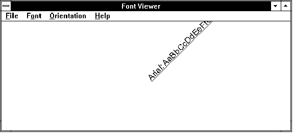 Графический интерфейс GDI в Microsoft Windows© Александр Фролов, Григорий ФроловТом 14, М.: Диалог-МИФИ, 1993, 288 стр. 5.3. Приложение FONTVIEWДля того чтобы вы могли быстро попробовать основные функции, предназначенные для выбора шрифта, мы подготовили приложение FONTVIEW. Меню "Font" приложения FONTVIEW позволяет вам выбрать шрифт двумя способами - вы можете указать семейство шрифта или выбрать конкретный шрифт при помощи диалоговой панели "Font". Меню "Orientation" позволяет задать угол поворота текстовой строки, выводя ее с наклоном (рис. 5.3) или даже перевернутой "вверх ногами" (рис. 5.4).