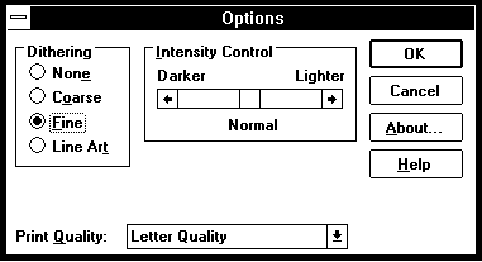 Рис. 6.3. Диалоговая панель "Options" для лазерного принтера HP LaserJet III Внешний вид диалоговой панели "Options" зависит от драйвера принтера, так как эта панель формируется функцией DeviceMode или ExtDeviceMode, расположенными в соответствующем драйвере принтера. Для сравнения на рис. 6.4 представлен внешний вид диалоговой панели "Options" для матричного принтера Epson FX-850.