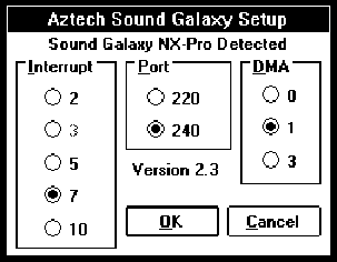 Рис. 1.5. Настройка параметров С помощью этой диалоговой панели вы должны указать номер прерывания, адрес порта ввода/вывода и номер канала прямого доступа. Эти параметры будут записаны в энергонезависимую память, расположенную в адаптере Sound Galaxy NX Pro. В адаптерах других типов для настройки параметров могут использоваться перемычки или переключатели, расположенные на плате звукового адаптера. Устанавливая параметры, следите за тем, чтобы они не конфликтовали с параметрами другого оборудования компьютера. Панель управления звуковым адаптеромВ комплекте утилит для адаптера Sound Galaxy NX Pro поставляется приложение winmix.exe, представляющее собой электронный микшерный пульт, управляющий работой адаптера (рис. 1.6). С другими адаптерами поставляются утилиты аналогичного назначения.