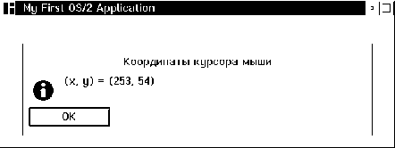 Позже, когда мы займемся диалоговыми панелями, мы расскажем об этой функции подробнее. Сейчас же достаточно сказать, что через третий параметр этой функции нужно передать адрес строки с сообщением, через четвертый - заголовок окна. Последий параметр определяет внешний вид диалоговой панели (количество и названия кнопок, пиктограмму, отображаемую в левой части диалоговой панели), В случае успешной инициализации наше приложение создает очередь сообщений, вызывая для этого функцию WinCreateMsgQueue . Если функция создания очереди выполнилась с ошибкой, на экран выводится соответствующее сообщение при помощи все той же функции WinMessageBox . Вслед за этим мы вызываем функцию WinTerminate (так как инициализация приложения была выполнена успешно). На следующем этапе функцией WinRegisterClass выполняется регистрация класса для окна Client Window . В качестве второго параметра этой функции мы указываем строку szWndClass, а в качестве третьего - имя функции окна WndProc. После успешной регистрации приложение создает свое главное окно, вызывая функцию WinCreateStdWindow , и запускает цикл обработки сообщений. Детали мы описали ранее, поэтому не будем повторяться. После того как из очереди сообщений будет выбрано сообщение WM_QUIT , функция WinGetMsg вернет значение FALSE и цикл обработки сообщений завершит свою работу. После этого функция main уничтожит главное окно приложения. Затем она удалит очередь сообщений и освободит ресурсы, полученные у системы Presentation Manager, вызвав функцию WinTerminate . На этом приложение завершит свою работу. Функция окнаФункция WndProc обрабатывает сообщения, поступающие в окно Client Window нашего приложения. Эта функция анализирует код сообщения, передаваемый ей через параметр msg и выполняет соответствующие действия. Наше приложение очень простое, поэтому и действий немного. Сообщение WM_ERASEBACKGROUND посылается в окно для того, чтобы функция окна подтвердила необходимость стирания фона окна Client Window . В зависимости от значения, которое возвратит функция окна в ответ на это сообщение, система Presentation Manager будет принимать решение о необходимости стирания. Если функция вренет значение 1, стирание следует выполнить, если 0 - нет. Экспериментируя с приложением, вы можете попробовать изменить возвращаемое значение на нулевое. Вы увидите, что при перемещении окно приложения Client Window не будет перерисовываться. Более детально процесс рисования в окне мы рассмотрим позже. А сейчас займемся сообщениями WM_BUTTON1DOWN и WM_BUTTON2DOWN . Эти сообщения посылаются в функцию окна, когда пользователь, поместив курсор мыши в область окна Client Window , сделает щелчок, соответственно, левой или правой клавишей мыши. Вместе с сообщениями WM_BUTTON1DOWN и WM_BUTTON2DOWN передаются параметры - текущие координаты курсора мыши. Координата по оси X передается через параметр mp1, а координата по оси Y - через параметр mp2. Для того чтобы отобразить эти координаты на экране, мы с помощью функции sprintf подготавливаем текстовую строку и вызываем функцию WinMessageBox . Обратите внимание, что в качестве второго параметра мы указываем идентификатор окна hWnd, который передается в функцию окна через первый параметр. Следует отметить, что вопрос использования координатных систем и координат не так прост, как может показаться на первый взгляд. Забегая вперед, скажем что вы можете выбирать одну из нескольких систем координат и изменять направление координатных о