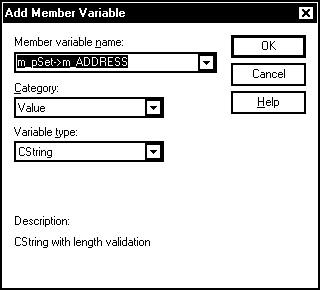 Рис. 5.12. Диалоговая панель Add Member Variable В нашем случае список Member variable name содержит строки, представляющие различные поля записи таблицы базы данных Address Pad. Выбирая остальные идентификаторы шаблона диалоговой панели IDD_DATER_FORM поставьте им в соответствие поля базы данных, как это показано на рисунке 5.13.