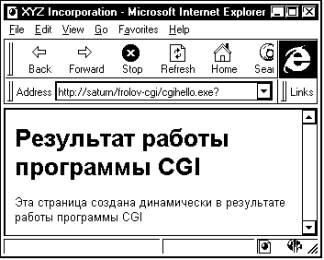 Рис. 7.6. Документ HTML, создаваемый динамически программой CGGIHELLO Рассмотрим исходный текст программы CGIHELLO (листинг 7.5). Листинг 7.5. Файл chap7\cgihello\cgihello.c