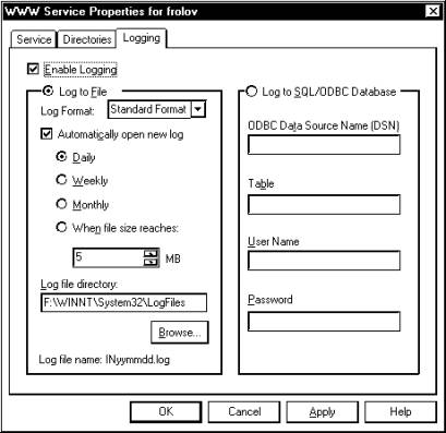 Рис. 9.27. Диалоговая панель Directory Properties Многое в этой диалоговой панели вам уже знакомо по серверу Microsoft Personal Web Service для Windows 95. В частности, в поле Virtual Directory вы можете задать для выбранного каталога имя соответствующего ему виртуального каталога. Например, на рис. 9.27 физическому каталогу e:\drweb\dll соответствует виртуальный каталог с именем /drweb. В группе органов управления Account Information вы можете указать имя пользователя и пароль для доступа к данному каталогу. Включив переключатель Virtual Server вы можете разместить на своем сервере еще один, виртуальный, сервер WWW. Для этого к сетевому адаптеру необходимо привязать еще один адрес IP, указав его в поле Virtual Server IP Address. Виртуальные серверы позволяют создать на одном физическом сервере несколько логических серверов, возможно, принадлежащих разным организациям и имеющих собственные адреса IP. Каждый такой адрес может быть отображен в доменной базе адресов на отдельное доменное имя, в результате чего создается полная иллюзия наличия нескольких отдельных серверов. Заметим, что виртуальные серверы создаются обычно на серверах крупных поставщиков услуг Internet. Последняя страница блокнота настроек параметров сервиса WWW называется Logging и представлена на рис. 9.28.
