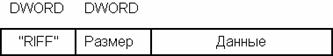 Рис. П1-1. Фрагмент "RIFF" Первое двойное слово заголовка содержит четырехбуквенный код FOURCC, который идентифицирует данные, хранящиеся во фрагменте. Второе двойное слово заголовка хранит размер области данных в байтах (без учета размера самого заголовка). Область данных имеет переменную длину, однако она должна быть выровнена на границу слова и при необходимости дополнена в конце нулевым байтом до целого числа слов. Заметим, что формат RIFF не описывает формат данных. Практически файл в формате RIFF может содержать любые мультимедиа данные, причем формат данных зависит от типа данных. Область, обозначенная на рис. П1-1 как «Данные», может содержать внутри себя другие фрагменты. Для файла, в котором хранятся звуковые данные (wav-файл), эта область содержит идентификатор данных «WAVE», фрагмент формата звуковых данных «fmt » (три символа «fmt» и пробел на конце), а также фрагмент звуковых данных (рис. П1-2).