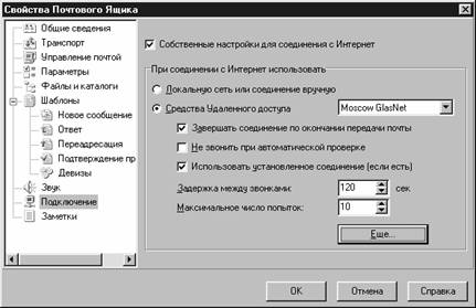Рис. 4-22. Вкладка Звук окна настройки параметров почтового ящика В поле Время, когда мелодия разрешена, можно указать интервал времени, когда упомянутая выше звуковая сигнализация будет работать. Вкладка Подключения (рис. 4-23) позволит Вам задать параметры для установки соединения с Интернетом при запуске программы The Bat!.