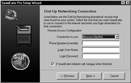 Рис. 6-20. Выбор параметров соединения для подключения к Интернету Далее в окне, показанном на рис. 6-21, необходимо указать способ, которым утилита SpamEater Pro будет извещать Вас обо всех событиях, связанных с обработкой почты.
