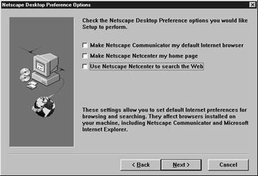 Рис. П2-6. Назначение компонентов браузера для обработки файлов некоторых типов Если, например, Вы поставите флажок Hypertext Markup Language, то браузер Netscape Communicator можно использовать для создания и редактирования страниц HTML. В том случае, когда эту работу, согласно Вашему замыслу, должна выполнять другая программа (например, редактор Microsoft FrontPage), указанный флажок отмечать не следует. Аналогично флажок JavaScript Source File позволяет назначить браузер Netscape Communicator в качестве программы редактирования сценариев JavaScript, принятой по умолчанию. Тем из Вас, кто в ближайшее время не собирается создавать свои страницы HTML, мы советуем снять оба флажка. Флажки JPEG Image и GIF Image позволяют назначить браузер Netscape Communicator в качестве программы просмотра содержимого графических файлов соответствующих форматов. Если эта работа выполняется другими программами, снимите отметку с указанных флажков. Далее, в очередном окне мастера установки нам предстоит оценить еще три возможности (рис. П2-7).