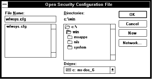 Рис. 12.1. Диалоговая панель "Open Security Configuration File" Пользуясь этой диалоговой панелью, вы должны выбрать файл wfwsys.cfg и затем нажать кнопку "OK". На экране появится диалоговая панель "Security Settings" (рис. 12.2), с помощью которой можно изменять содержимое файла wfwsys.cfg .