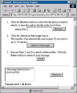 На сегодня нам известно несколько практических реализаций этого протокола RFC1867. Например, технология удаленной загрузки файлов применяется в системах бесплатной электронной почты, таких как HotMail или NetAddress. Как известно, классическая электронная почта допускает возможность передачи вместе с текстовым сообщением дополнительных файлов вложений (attachments). Системы бесплатной электронной почты обычно создаются на базе серверов Web, причем для работы с почтовыми сообщениями пользователи применяют не специальные почтовые программы, а браузеры. Что же касается файлов вложений, то их предлагается добавлять через упомянутый выше протокол RFC1867. На рис. 3 показана соответствующая страница сервера HotMail. Здесь вам предлагается вначале выбрать файл, нажав кнопку Browse, а затем добавить его к сообщению при помощи кнопки Attach to Message. Аналогичная технология применяется и на сервере NetAddress. Загрузка файлов пользователя через протокол RFC1867 применяется на серверах http://www.geocities.com и http://www.spree.com для формирования личных домашних страниц (рис. 4). Здесь допускается указывать сразу несколько файлов, которые будут загружены на сервер с вашего локального диска.